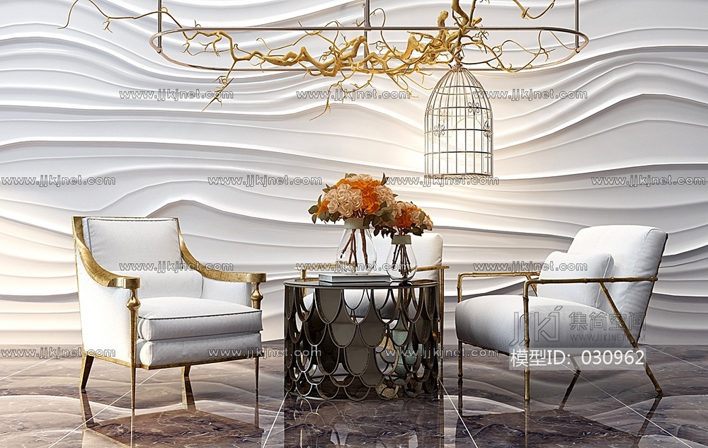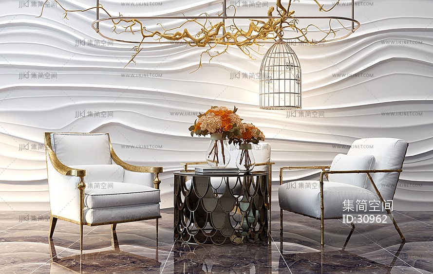 Z09-0221单人休闲椅茶几树枝鸟笼吊灯波浪墙组合 3d模型下载 [模型ID:30962]