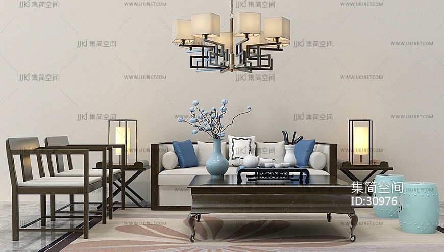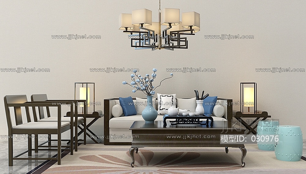Z01-0227Z新中式沙发茶几鼓凳吊灯组合 3d模型下载 [模型ID:30976]