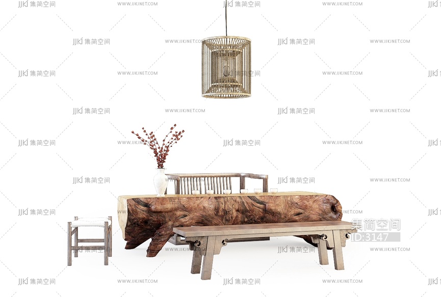 -侘寂茶桌椅组合_根雕_茶台_松树 3d模型下载