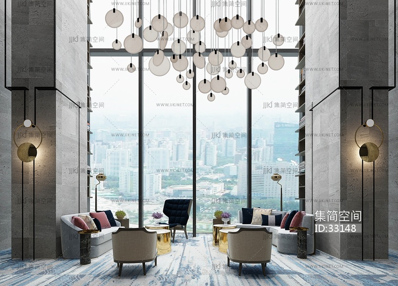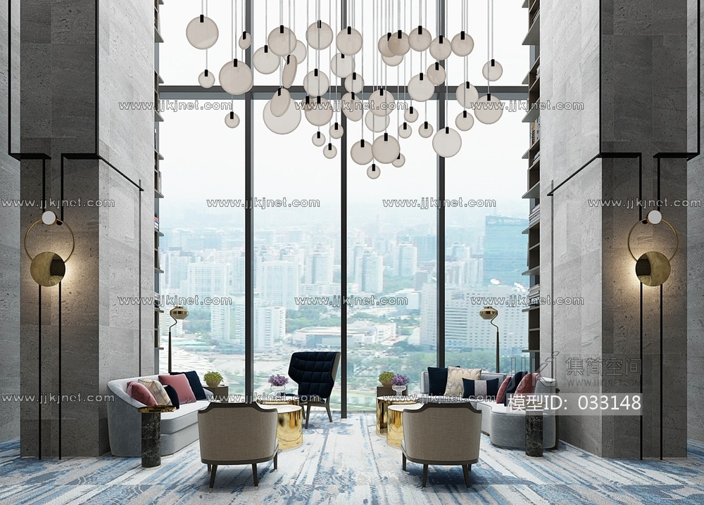 H02-0302现代轻奢新中式酒店接待休闲区沙发茶几壁灯大型艺术吊顶 3d模型下载 [模型ID:33148]