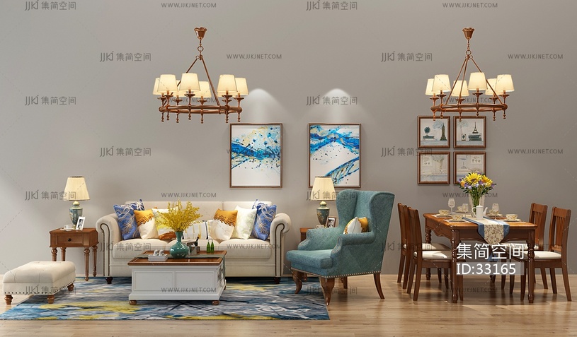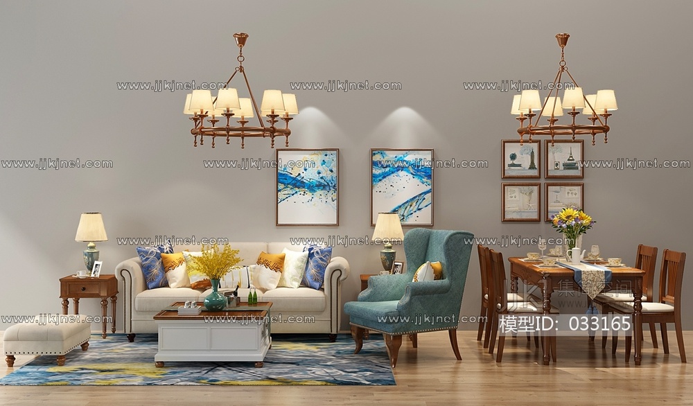 H09-0304美式欧式沙发茶几餐桌椅铁艺吊灯 3d模型下载 [模型ID:33165]