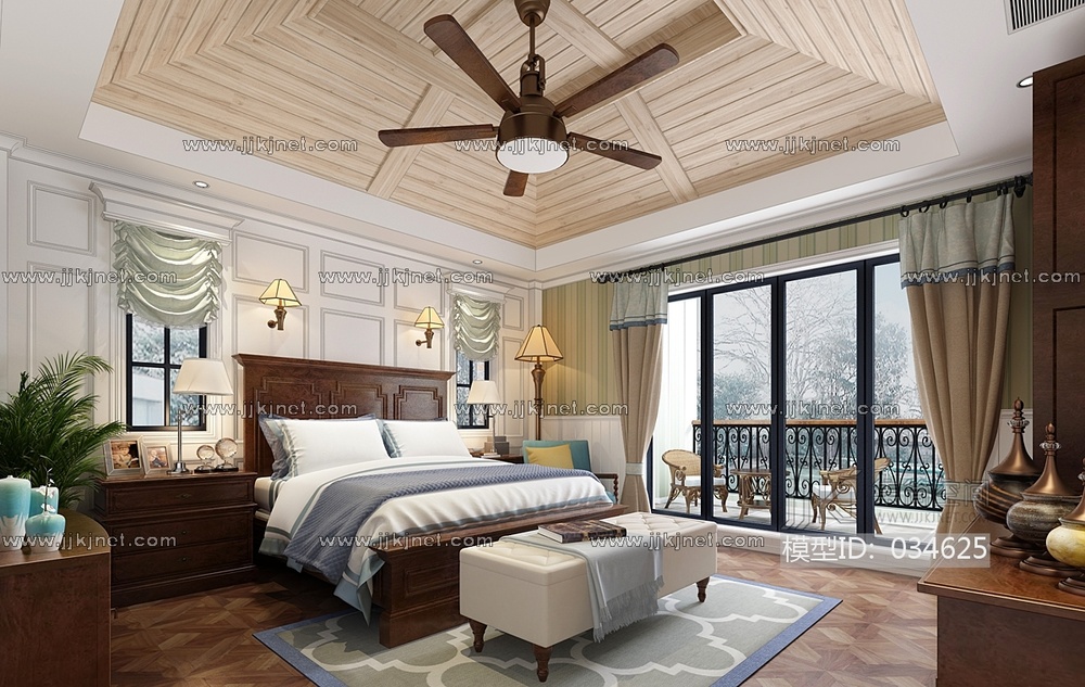 H13-0308美式欧式地中海卧室床床头柜风扇灯藤椅 3d模型下载 [模型ID:34625]