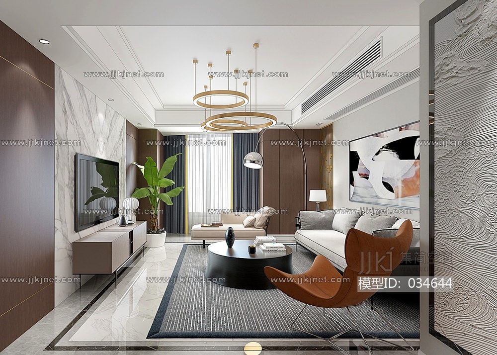 中古风客厅,美式客厅,圆形茶几,装饰画,移动电视,3d模型下载