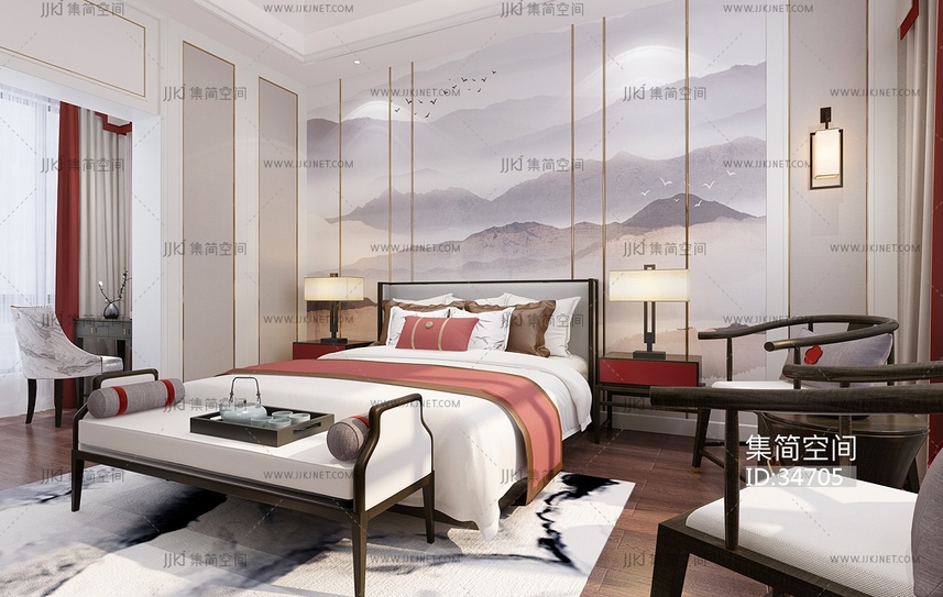 H02-0327新中式卧室主人房床床头柜圈椅床榻 3d模型下载 [模型ID:34705]