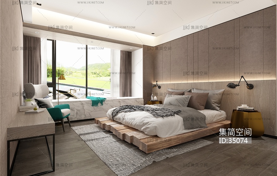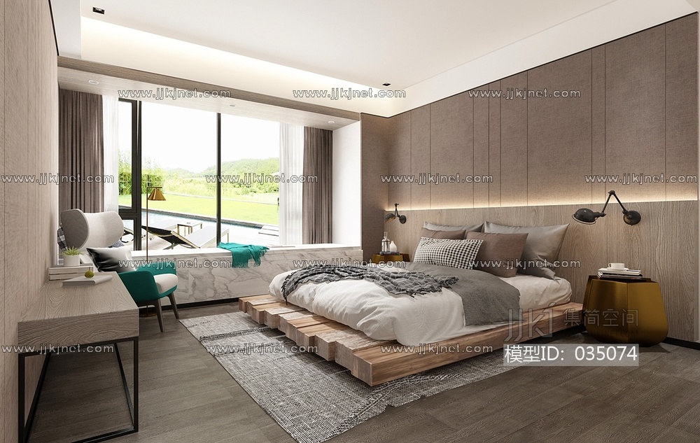 卧室,轻奢,暗黑风,现代轻奢卧室双人床,懒人沙发法式卧室3d模型下载