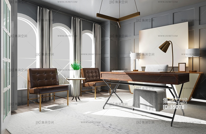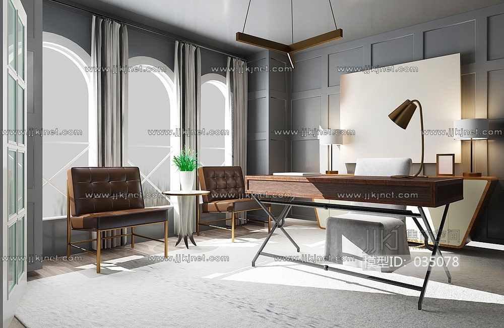 现代书房 书桌椅 壁柜 挂画 吊灯 书 盆栽 摆件3d模型下载