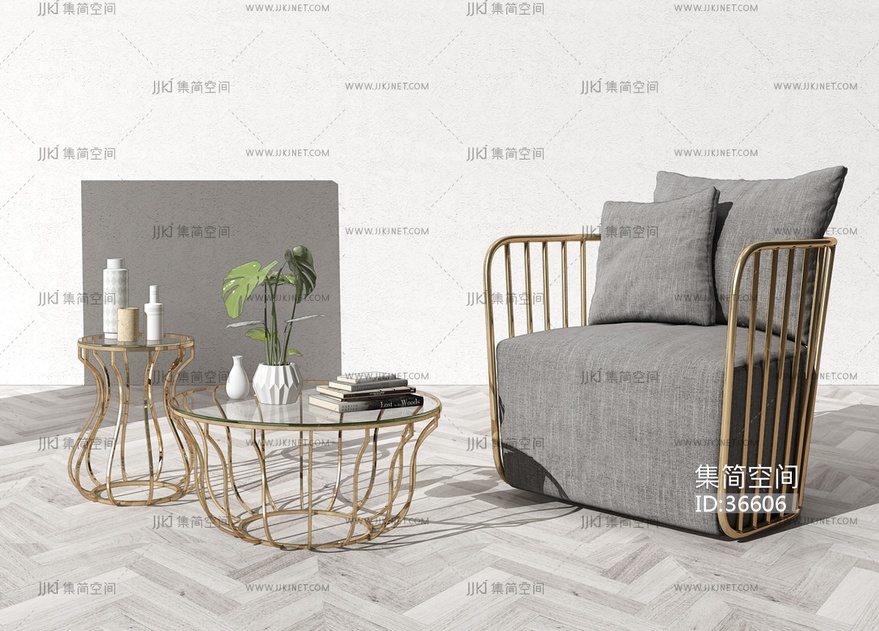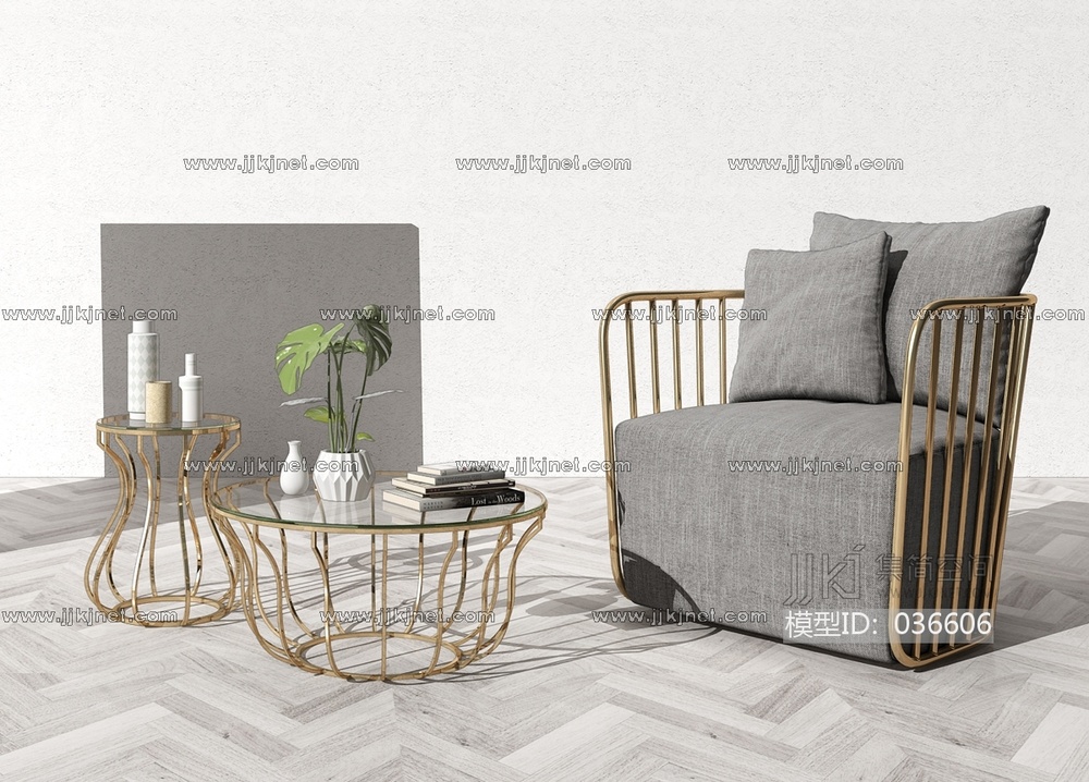 H12-0329现代轻奢新中式单人沙发茶几边几组合 3d模型下载 [模型ID:36606]