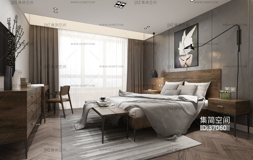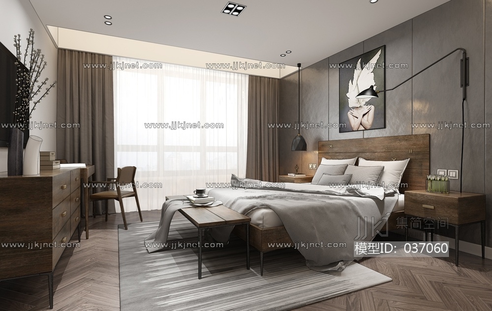 H12-0410工业风现代卧室实木双人床 3d模型下载 [模型ID:37060]