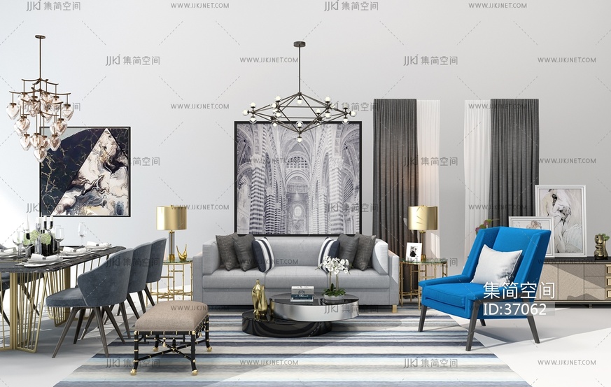 H14-0410简欧式后现代客厅软装搭配沙发茶几餐桌椅吊灯 3d模型下载 [模型ID:37062]