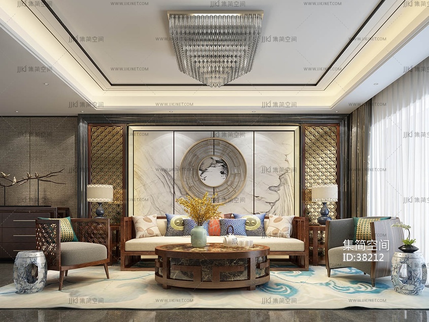 Z24-0408新中式东南亚客厅沙发茶几背景墙鼓凳吸顶灯 3d模型下载 [模型ID:38212]