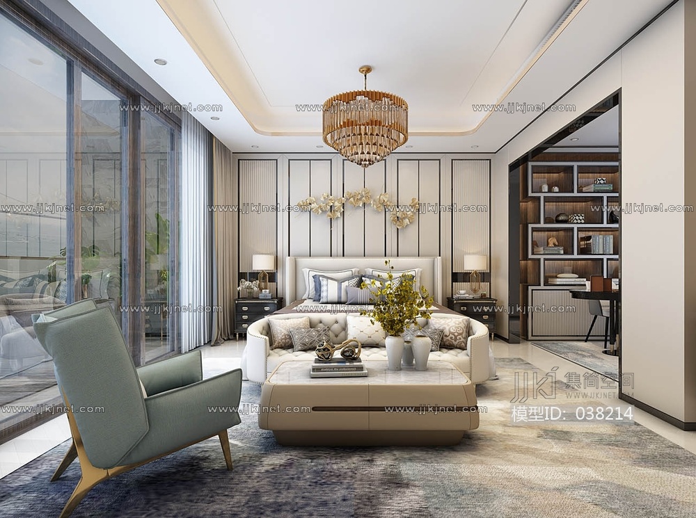卧室,轻奢,暗黑风,现代轻奢卧室双人床,懒人沙发法式卧室3d模型下载