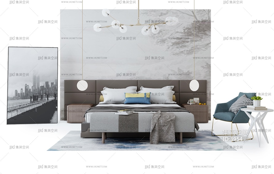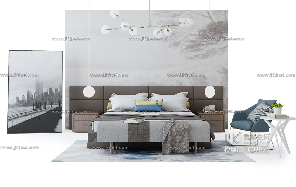 Z29-0608北欧床床椅子吊灯组合副本 3d模型下载 [模型ID:3954]