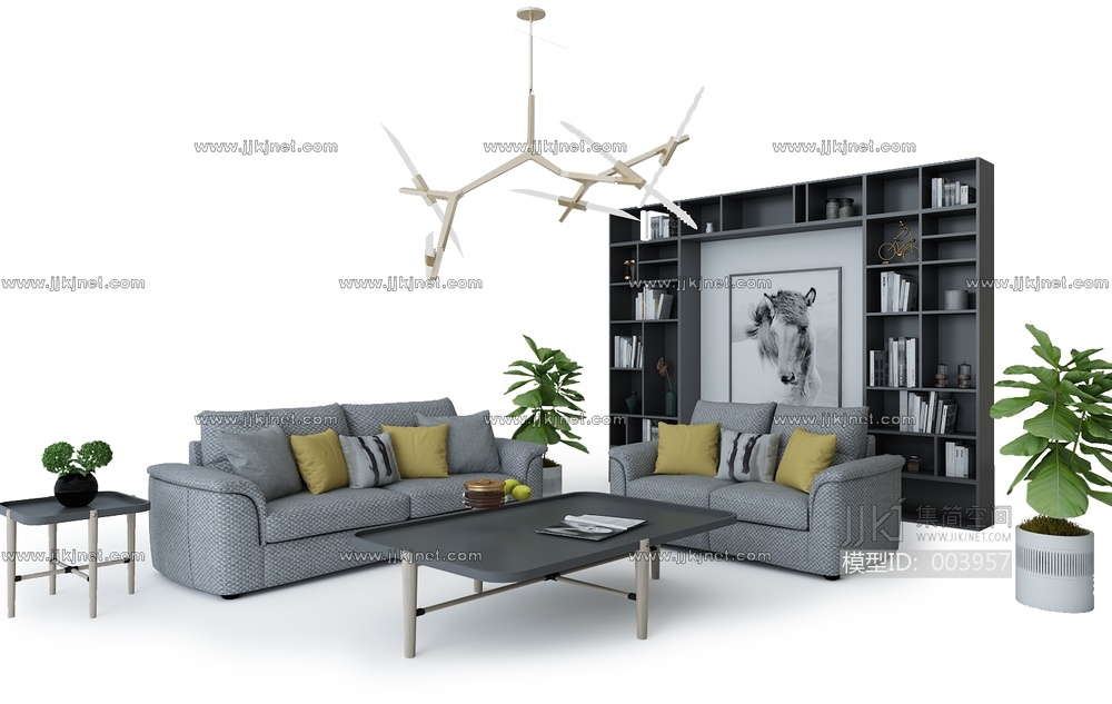 Z28-0608现代沙发电视柜茶几书柜吊灯组合 3d模型下载 [模型ID:3957]