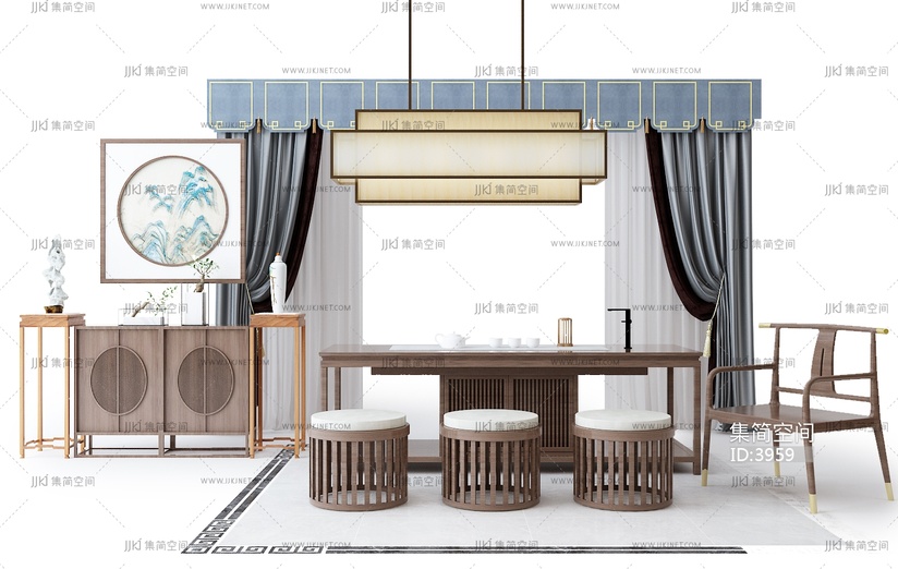 Z01-0608中式茶桌玄关柜吊灯组合 3d模型下载 [模型ID:3959]