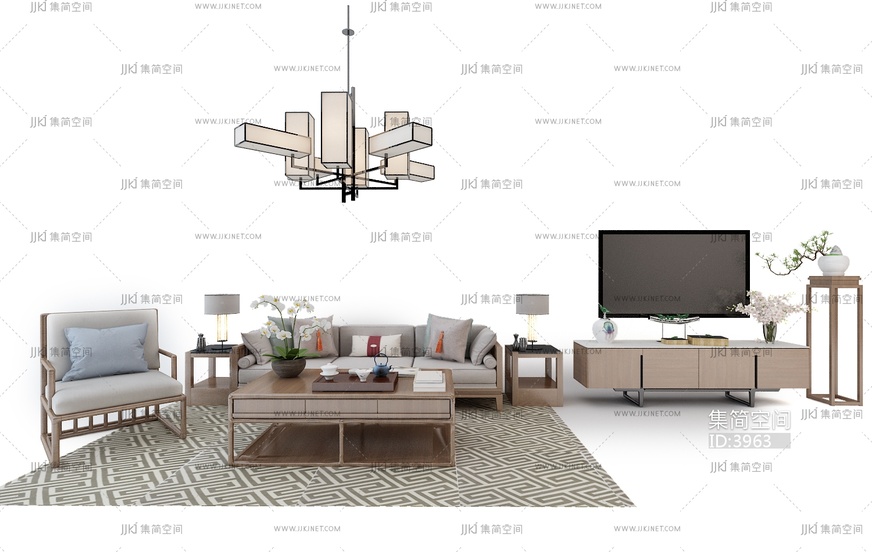 Z05-0608中式沙发电视柜吊灯组合-01 3d模型下载 [模型ID:3963]