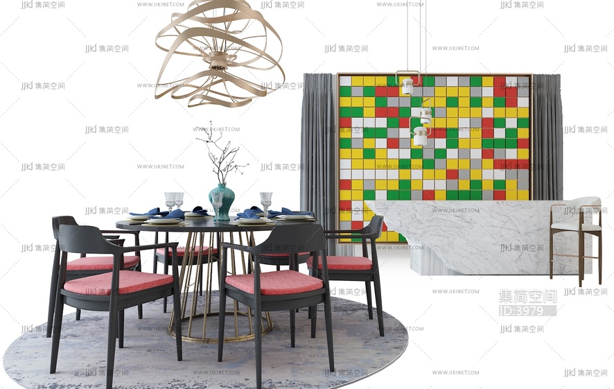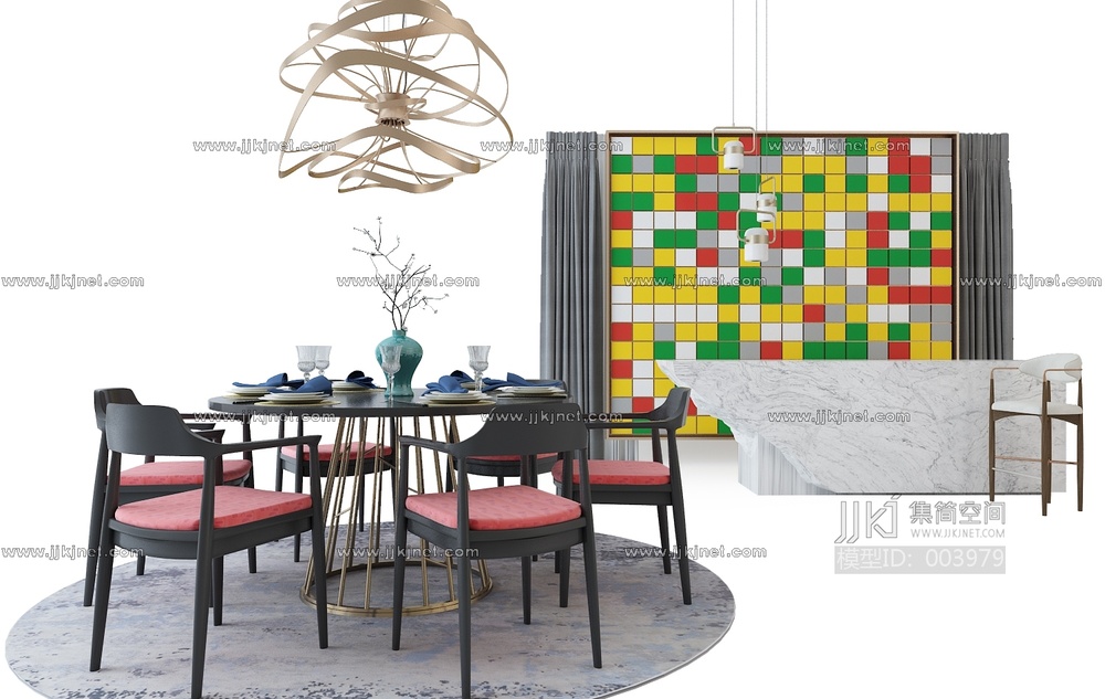 H12现代中式餐桌椅组合吧台 3d模型下载 [模型ID:3979]