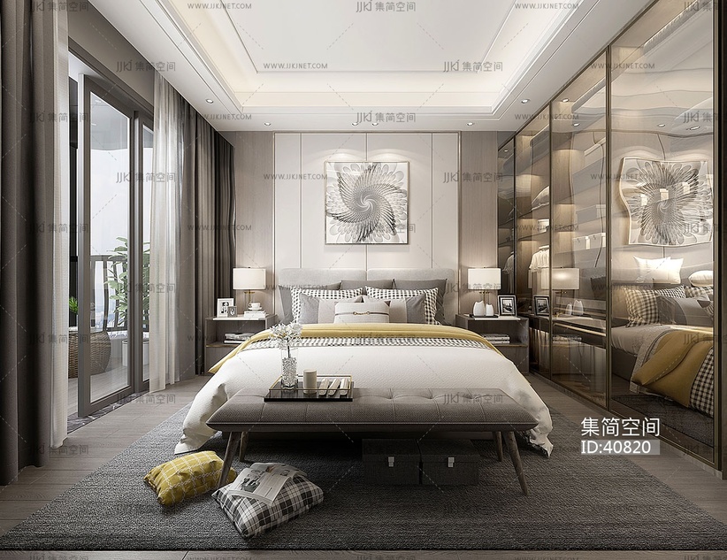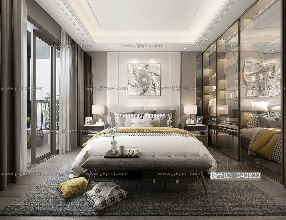 H06-0522现代轻奢新中式卧室双人床床头柜抱枕衣柜床尾凳 3d模型下载 [模型ID:40820]