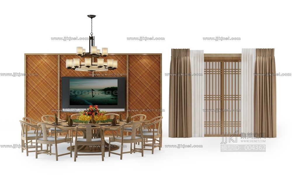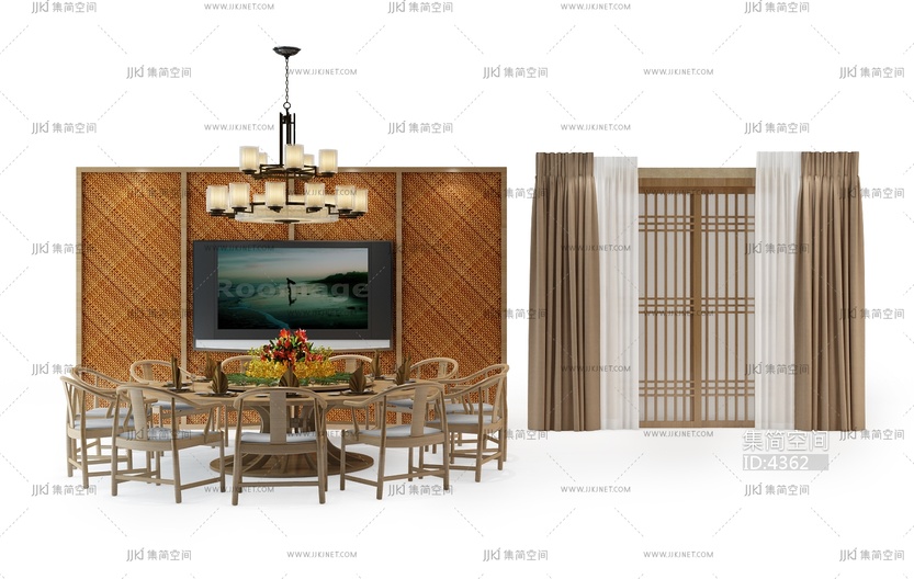 中式餐桌、灯具、窗帘组合 3d模型下载 [模型ID:4362]