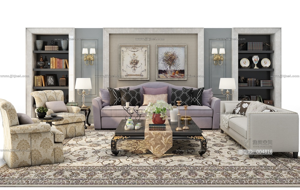 Z08-0707简欧沙发茶几书柜组合 3d模型下载 [模型ID:4816]