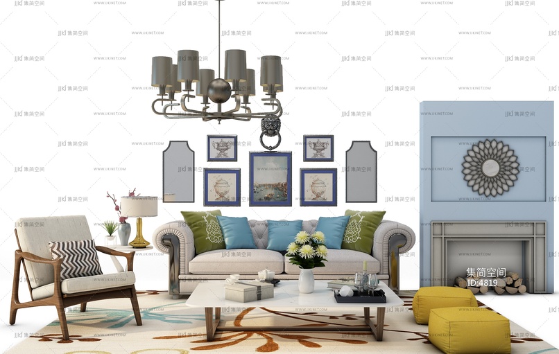 Z12-0707欧式沙发壁炉吊灯茶几组合 3d模型下载 [模型ID:4819]