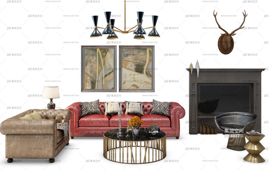 03-奶油中古沙发组合_沙发茶几组合_异形沙发_金属茶几_单人休闲椅_模块沙发3D模型3d模型下载