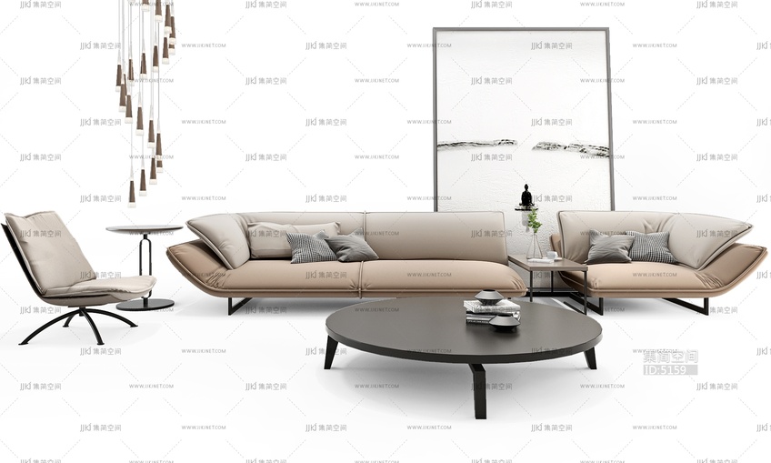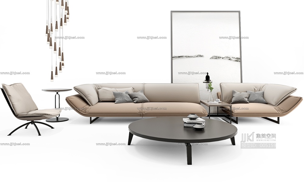 03-奶油中古沙发组合_沙发茶几组合_异形沙发_金属茶几_单人休闲椅_模块沙发3D模型3d模型下载