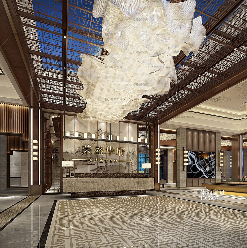 新中式售楼处入口大堂服务太接待台3D模型3d模型下载