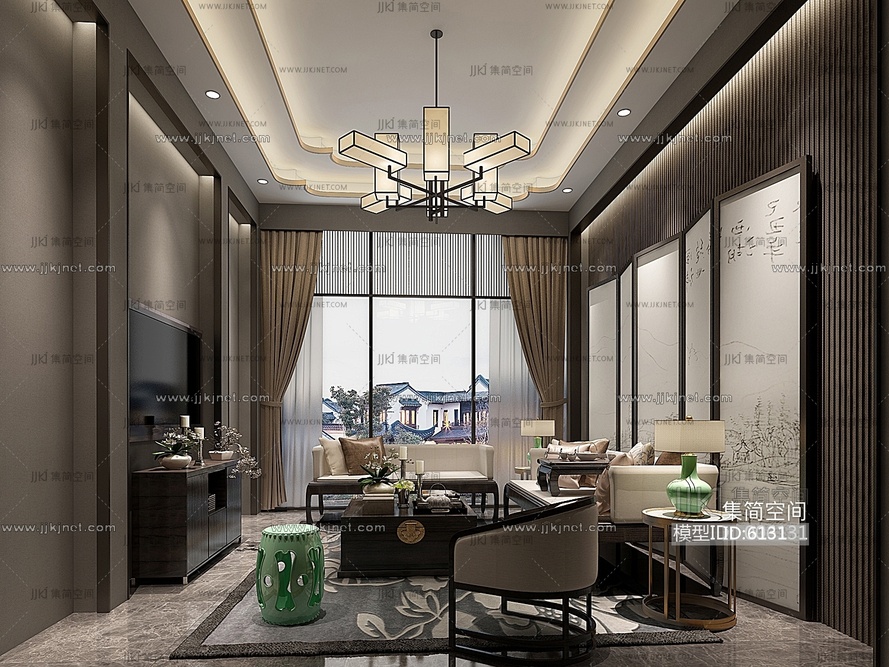 新中式洽谈室客厅中式沙发罗汉床鼓凳木箱茶几 3d模型下载 [模型ID:6131]