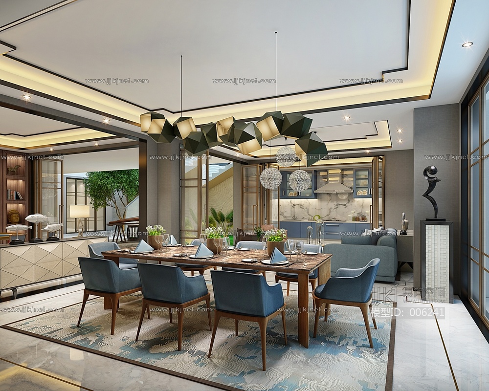 04-11新中式餐厅餐桌椅吊灯橱柜 3d模型下载 [模型ID:6241]