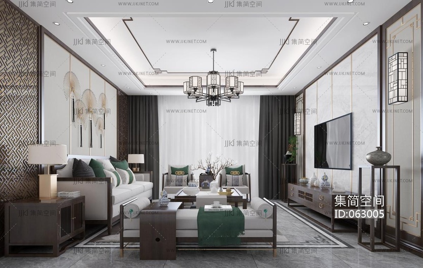 中古风客厅 沙发茶几组合 背景墙3d模型下载
