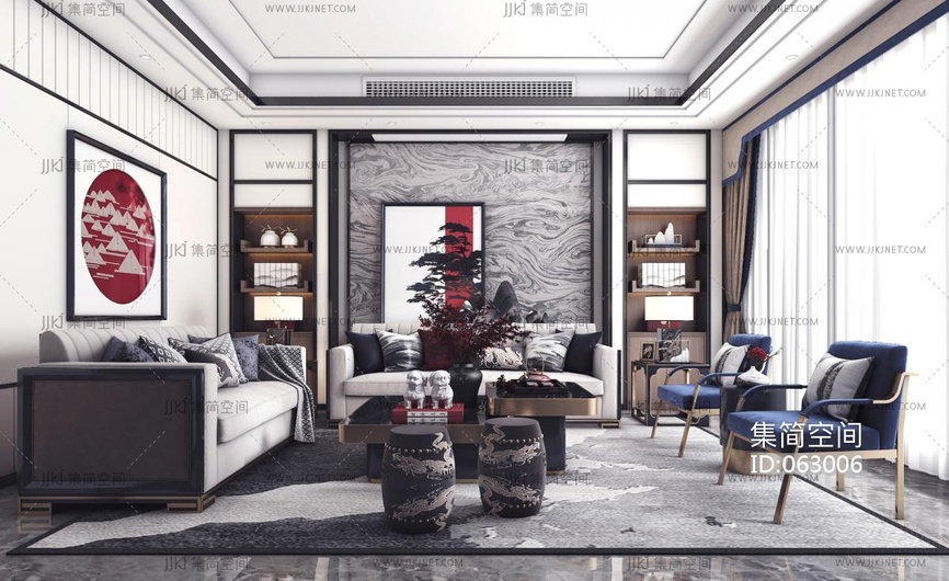 Z04-0806新中式客厅沙发茶几休闲椅子书柜靠包抱枕圆形鼓凳 3d模型下载 [模型ID:63006]