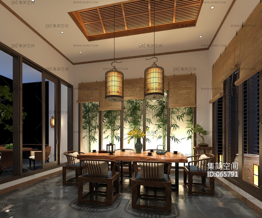中式茶楼茶室茶桌椅鸟笼吊灯竹子 3d模型下载 [模型ID:65791]