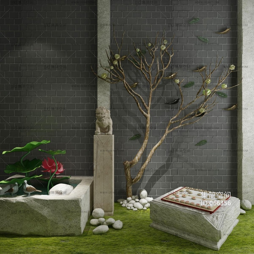 Z03-0918中式景观荷花水景干支树枝石槽中国象棋石头鹅卵石 3d模型下载 [模型ID:66356]