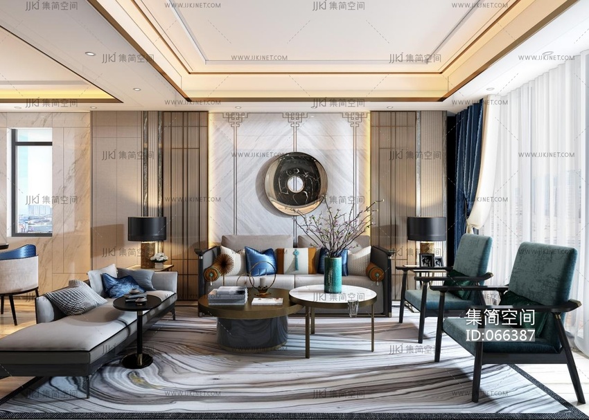 06新中式样板间别墅客厅,沙发茶几,卧榻,美人榻,贵妃榻,椅子花瓶,摆件,抱枕靠包 3d模型下载 [模型ID:66387]