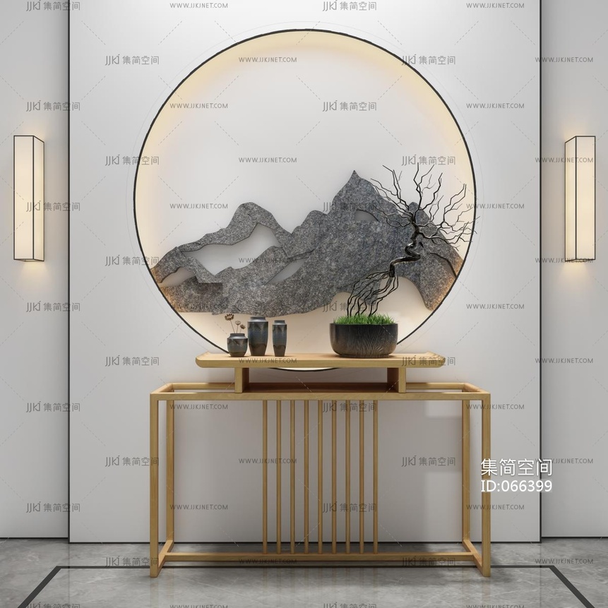 新中式实木玄关柜摆台条案干支盆景摆件圆形背景墙 3d模型下载 [模型ID:66399]