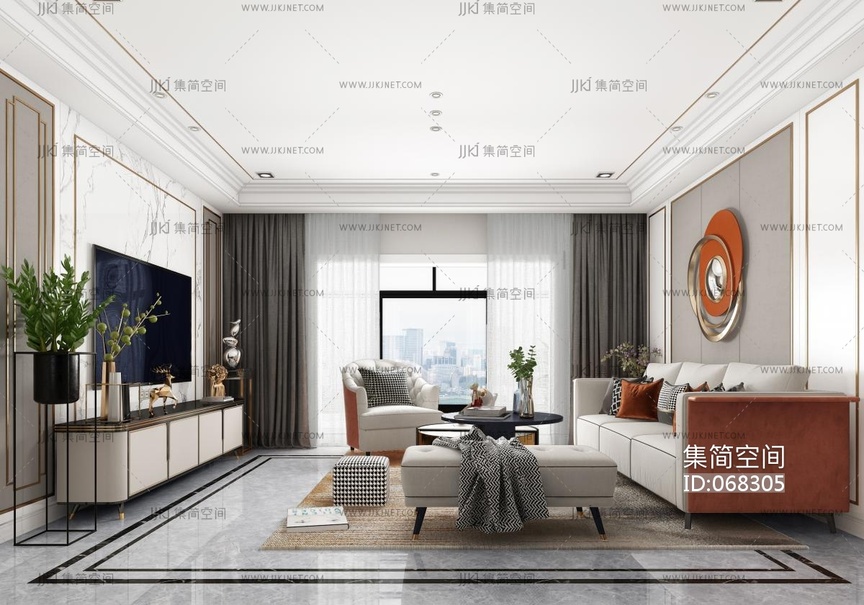 中古风客厅,美式客厅,圆形茶几,装饰画,移动电视,3d模型下载