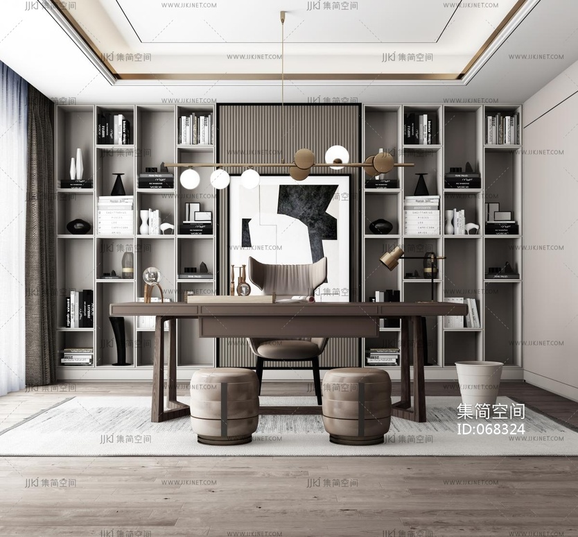 现代书房 书桌椅 壁柜 挂画 吊灯 书 盆栽 摆件3d模型下载