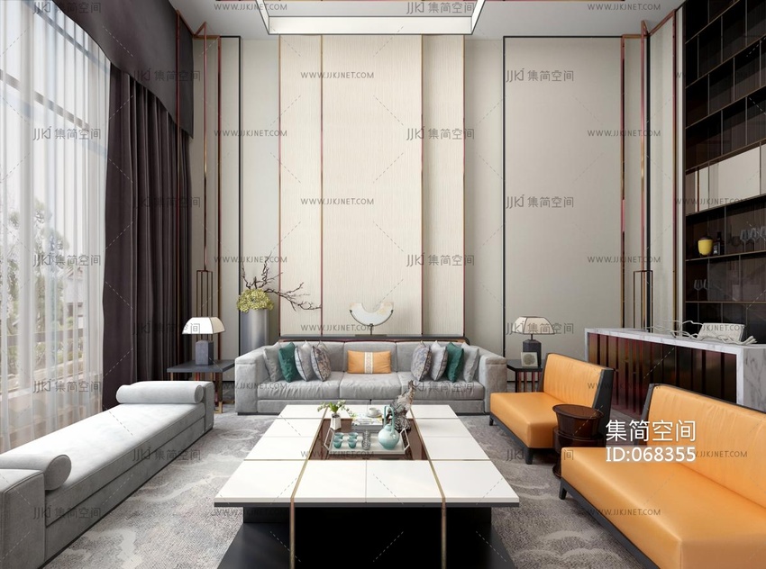 中古风客厅 沙发茶几组合 背景墙3d模型下载