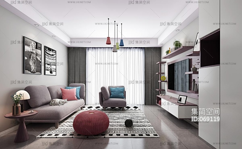 中古风客厅,美式客厅,圆形茶几,装饰画,移动电视,3d模型下载