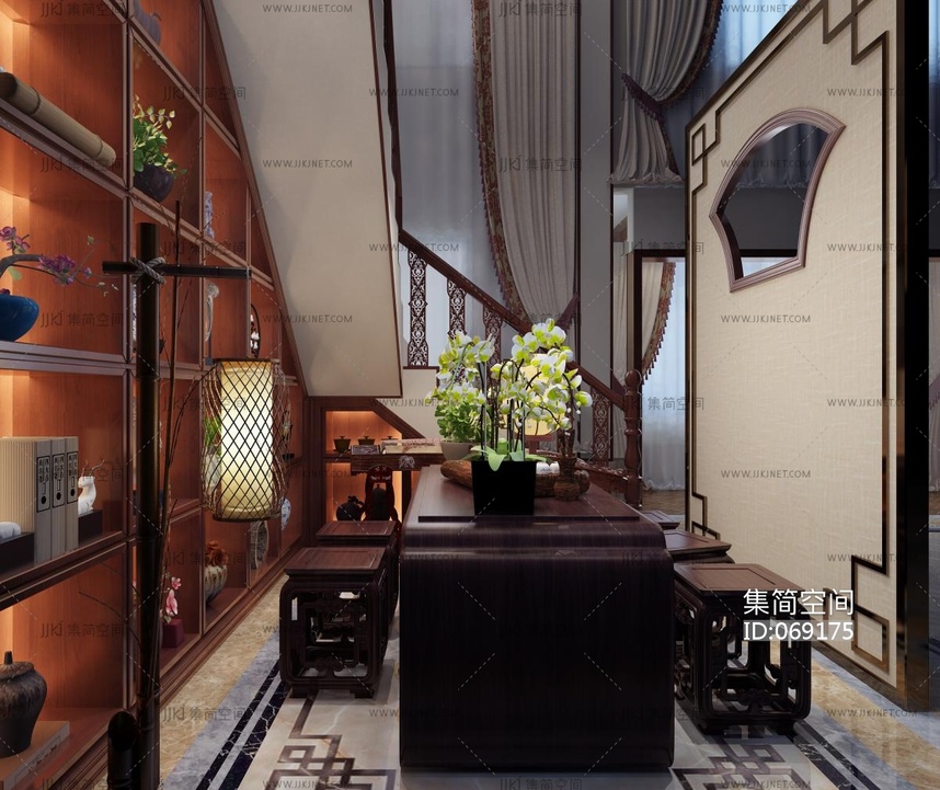 现代书房 书桌椅 壁柜 挂画 吊灯 书 盆栽 摆件3d模型下载