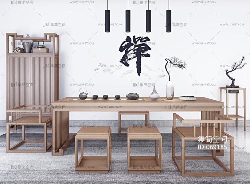 新中式茶室茶桌椅子茶台边柜花架 3d模型下载 [模型ID:69185]