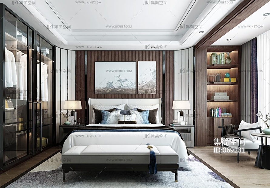 卧室,轻奢,暗黑风,现代轻奢卧室双人床,懒人沙发法式卧室3d模型下载