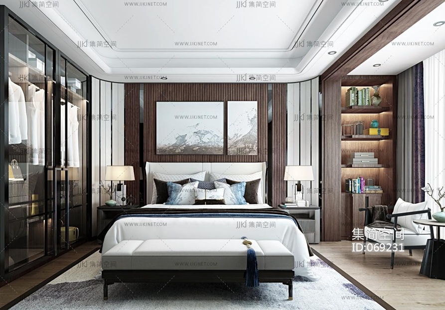 现代 卧室 双人床,床头柜,台灯玻璃衣柜3d模型下载
