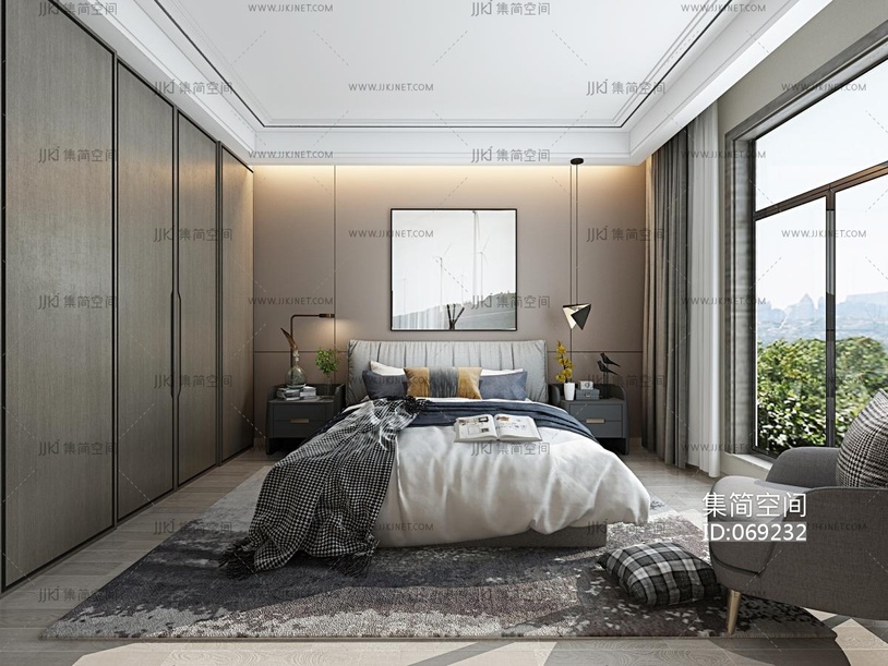 卧室,轻奢,暗黑风,现代轻奢卧室双人床,懒人沙发法式卧室3d模型下载