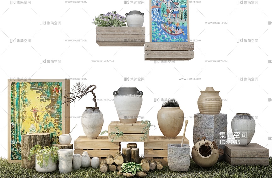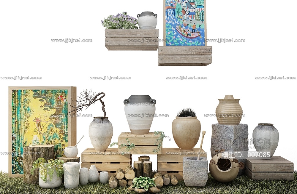 G52-0910陶罐干枝装饰品摆件瓶子 3d模型下载 [模型ID:7085]
