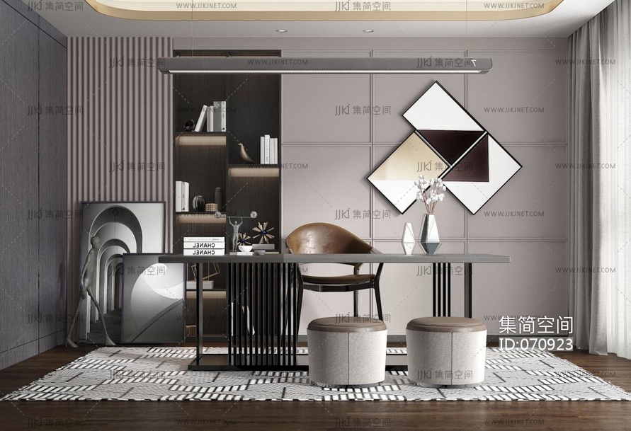 现代书房 书桌椅 壁柜 挂画 吊灯 书 盆栽 摆件3d模型下载