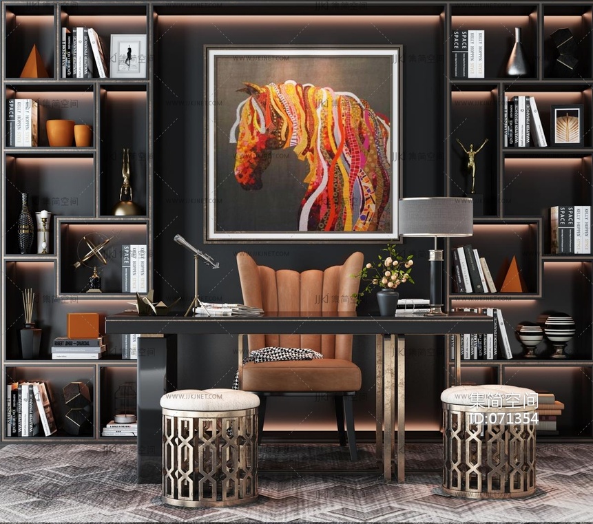 Z04-1030现代轻奢简欧式新古典美式书房树桌椅子金属圆凳书柜 3d模型下载 [模型ID:71354]