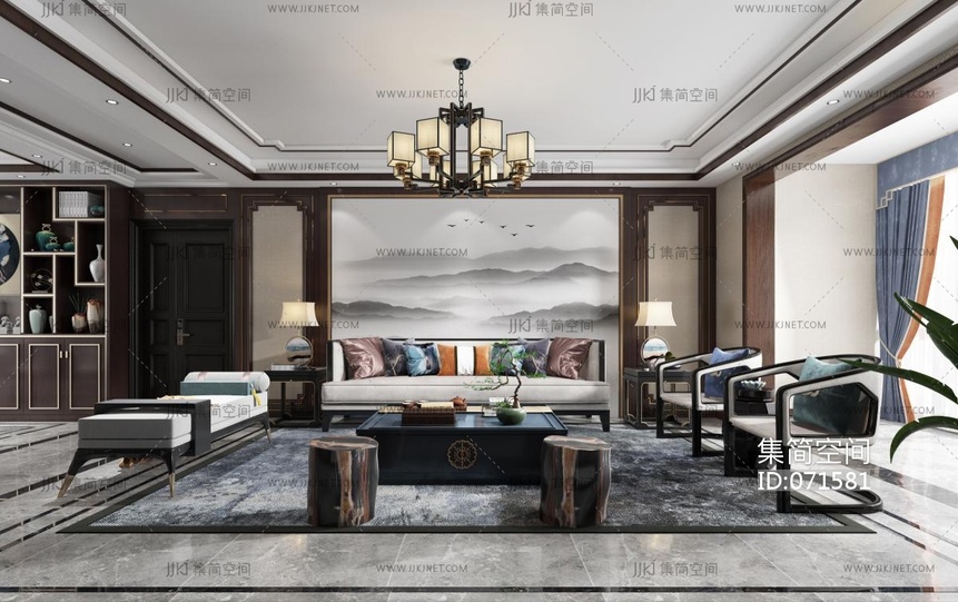 中古风客厅 沙发茶几组合 背景墙3d模型下载