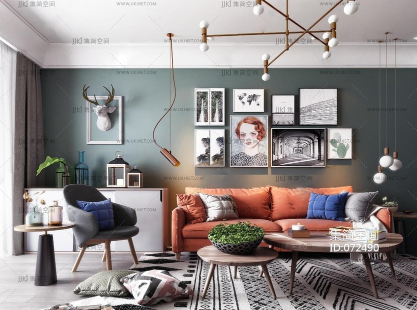 中古风客厅,美式客厅,圆形茶几,装饰画,移动电视,3d模型下载