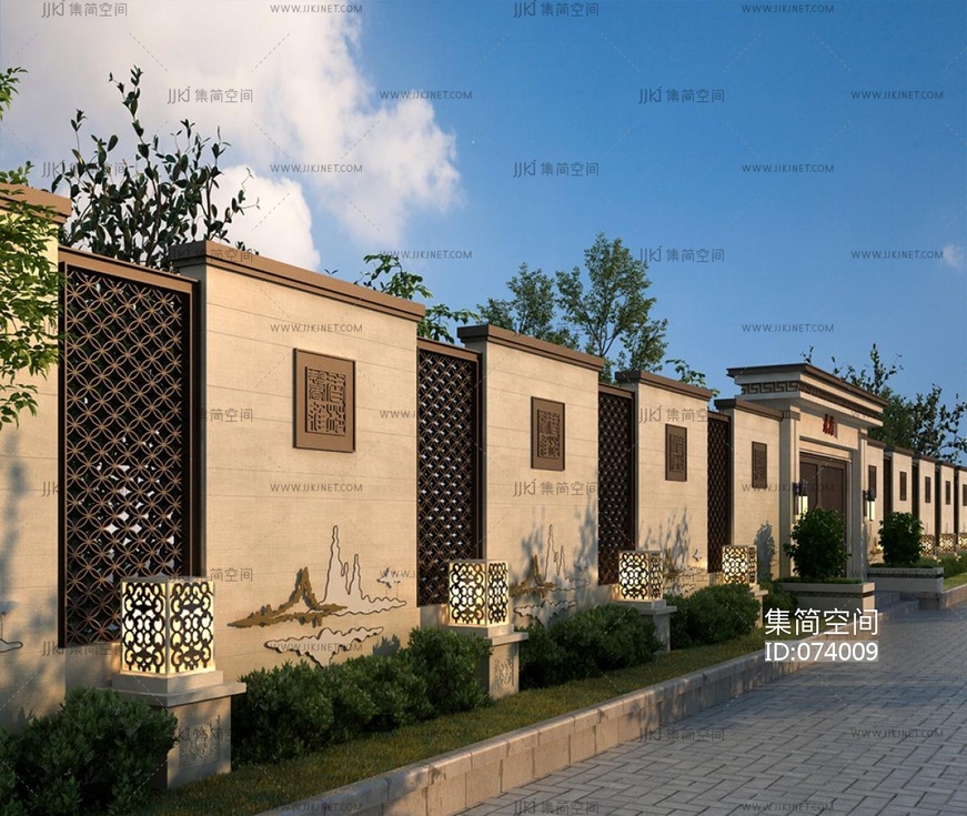 09新中式别墅建筑围墙院墙入口大门 3d模型下载 [模型ID:74009]